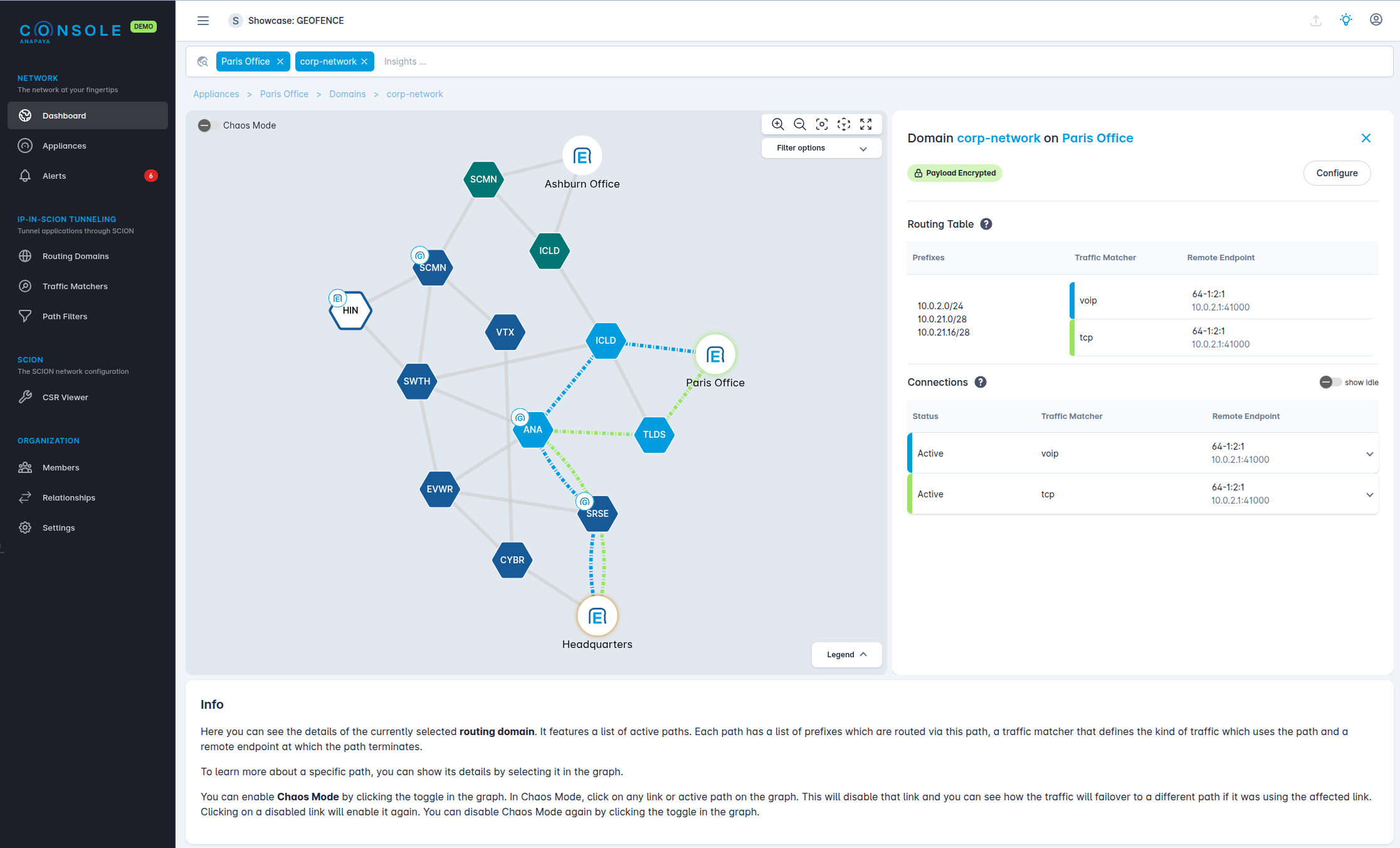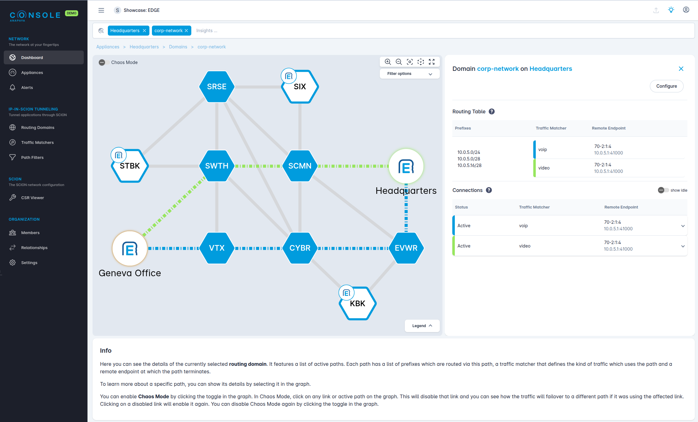Experience the Anapaya CONSOLE firsthand with our interactive demo, featuring three practical use cases that demonstrate the capabilities and flexibility of SCION and the Anapaya product suite. Use this demo as your sandbox to explore both the Anapaya CONSOLE and the SCION Internet.